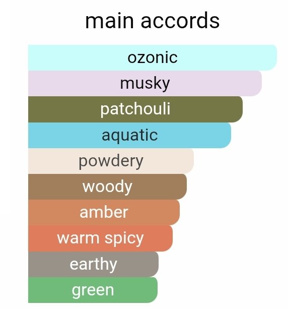 شروع رایحه با برگ بنفشه فضایی سبز، پودری و کمی تلخ ایجاد میکند که امضای اصلی این عطر به شمار میرود. در نت میانی، کهربا و نعنا هندی گرما و عمق بیشتری به رایحه میبخشند و حس مردانگی عطر را تقویت میکنند. در نت پایانی، مشک خالص و تمیز باقی میماند که رایحهای اغواگر، نرم و ماندگار روی پوست ایجاد میکند.