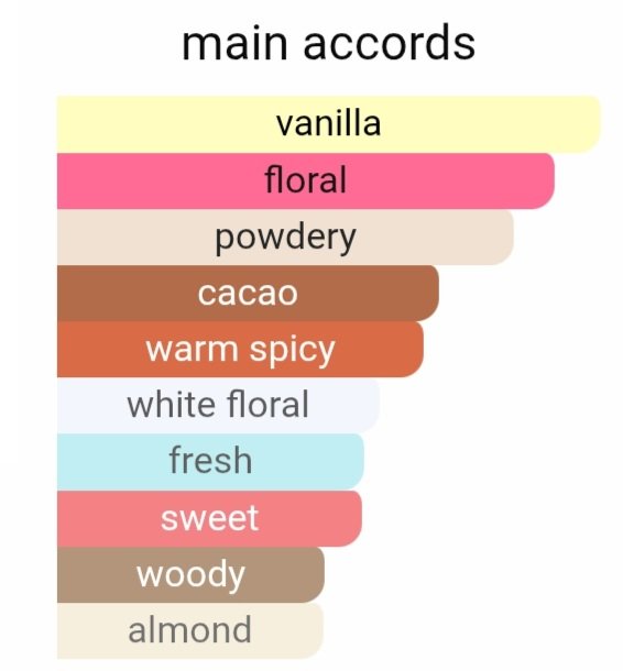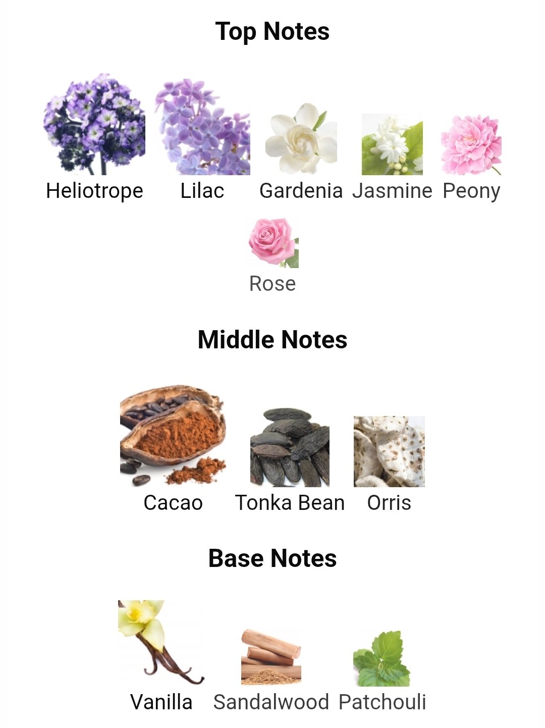 در نت ابتدایی، ترکیبی رویایی از گل رز، یاس، گاردنیا، گل صدتومانی و گل آفتابپرست فضایی کاملاً زنانه و لطیف ایجاد میکند. لحظاتی بعد، نتهای کاکائو، دانه تونکا و ریشه زنبق ظاهر میشوند تا عطری شیری–پودری، گرم و مجلل بسازند. در پایان، وانیل، چوب صندل سفید و نعنا هندی عطر را عمیقتر کرده و حس آرامش و جذابیت بیشتری به آن میبخشند.