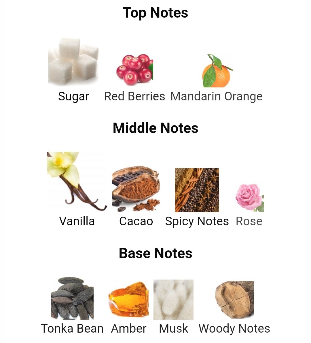 در نت ابتدایی، ترکیب قند، توت قرمز و پرتقال ماندارین رایحهای شیرین، جذاب و دوستداشتنی ایجاد میکند که شروعی دلپذیر و گرم به عطر میدهد. نت میانی با حضور وانیل، کاکائو و گل سرخ، فضایی خامهای، عمیق و زنانه به رایحه میبخشد و شخصیت اصلی عطر را شکل میدهد. در نهایت، دانه تونکا، کهربا، مشک و نتهای چوبی ماندگاری و گرمای عطر را تقویت میکنند.