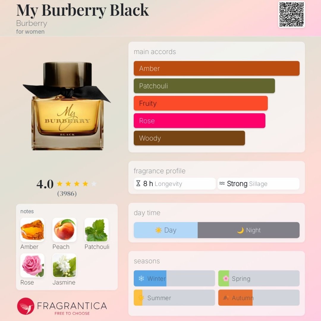 باربری مای باربری بلک زنانه عطری گرم و شیرین با حالوهوایی عمیق، شیک و زنانه است که در گروه بویایی شرقی گلی قرار میگیرد. این عطر انتخابی مناسب برای بانوانی است که رایحههای گرم، مجلسی و اغواگر را میپسندند.