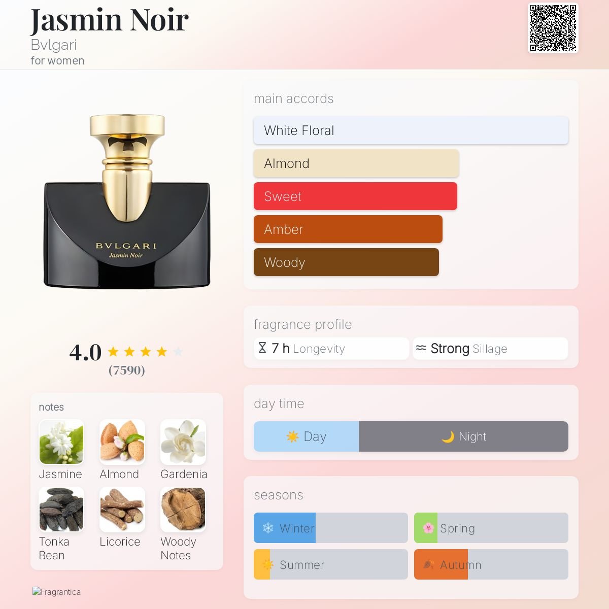 طر بولگاری جاسمین نویر، نمادی از رمز و راز، ظرافت و جذابیت زنانه در شبهای سرد است. این ادوپرفیوم با ترکیبی خاص از نتهای سبز و گاردنیای یاسمین آغاز میشود. به همین دلیل، در همان لحظات ابتدایی حسی از تازگی مرموز و وقار ایتالیایی را به اطرافیان منتقل میکند.