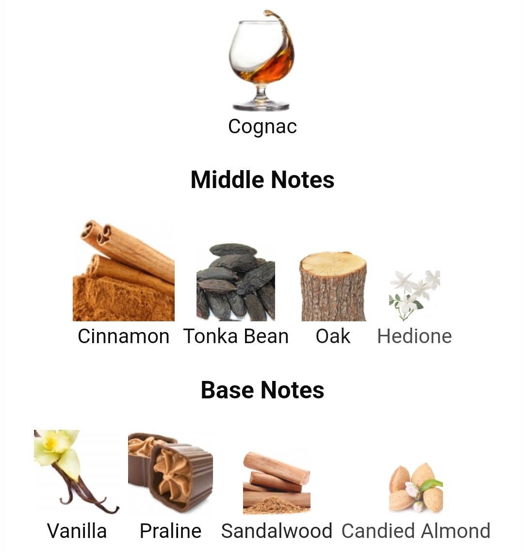 در آغاز رایحه، نت کنیاک فضایی گرم، شیرین و الکلیمانند ایجاد میکند که حس لوکس و متفاوتی به عطر میبخشد و شروعی غنی و دلنشین را رقم میزند.