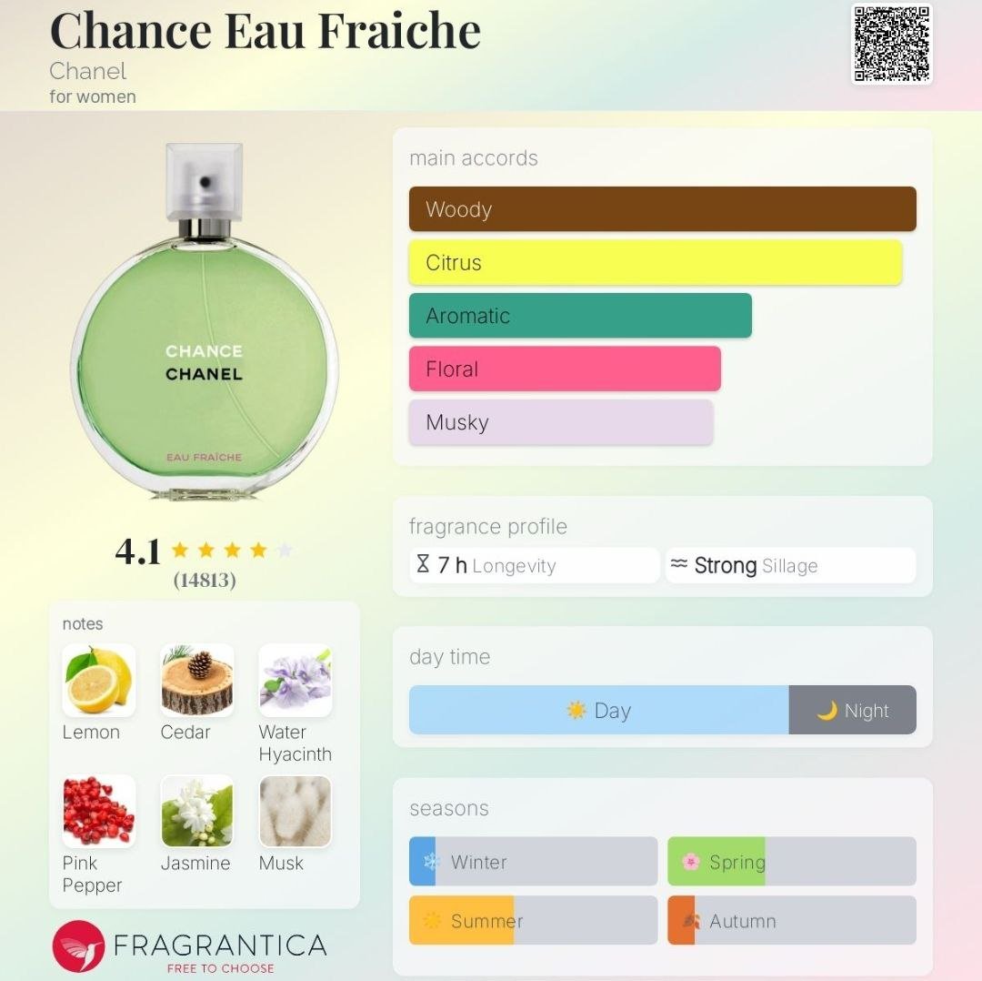 Chance Eau Fraîche با پخش بوی ملایم (7 از 10) و ماندگاری متوسط رو به خوب (7 از 10)، یک گزینه بینقص برای روزهای گرم سال، استفاده روزمره و محیطهای کاری است. این ادوتویلت زنانه، محصولی اصیل از فرانسه و یکی از محبوبترین نسخههای لاین Chance محسوب میشود.