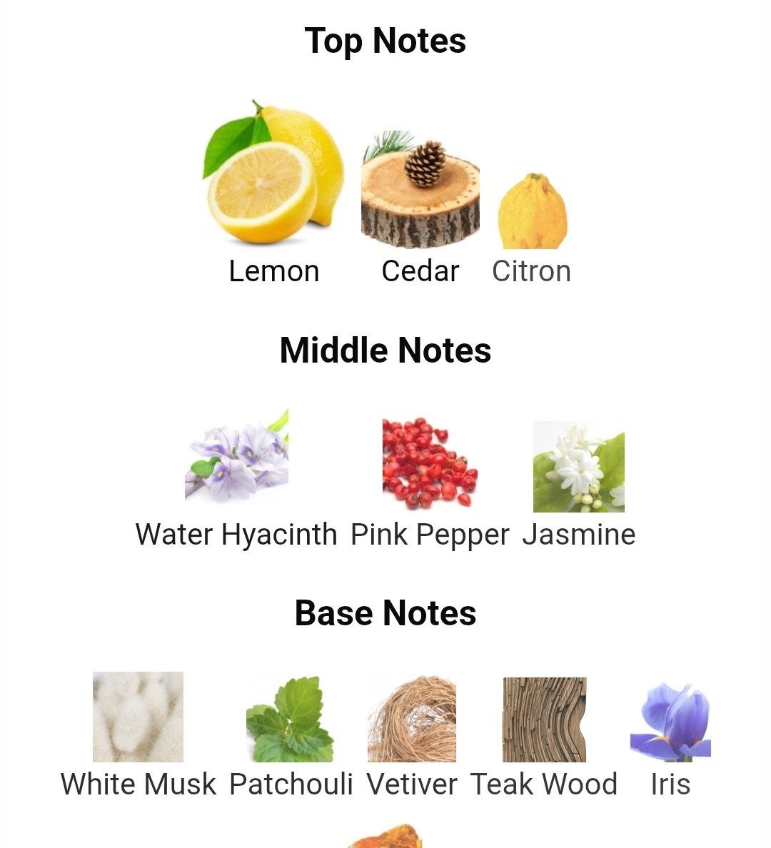 در پایان، هارمونی منحصربهفردی از زنبق، نعناع هندی، مشک سفید، خسخس، چوب ساج و کهربا رایحه را تکمیل میکند و تعادل جذابی بین خنکی، شیرینی و لطافت ایجاد میشود.
