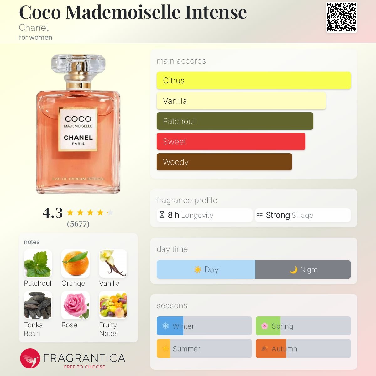 در لایه پایانی، غلظت بالای نعنا هندی در کنار وانیل و لوبیا تونکا، گرمایی مخملی به عطر میبخشد. این شاهکار فرانسوی با ماندگاری ۹ از ۱۰ و پخش بوی ۹ از ۱۰، دوام خیرهکنندهای بر روی پوست دارد. کوکو مادمازل اینتنس به خوبی نمادی از جذابیت بیپایان و شکوه خیرهکننده دنیای شنل است.