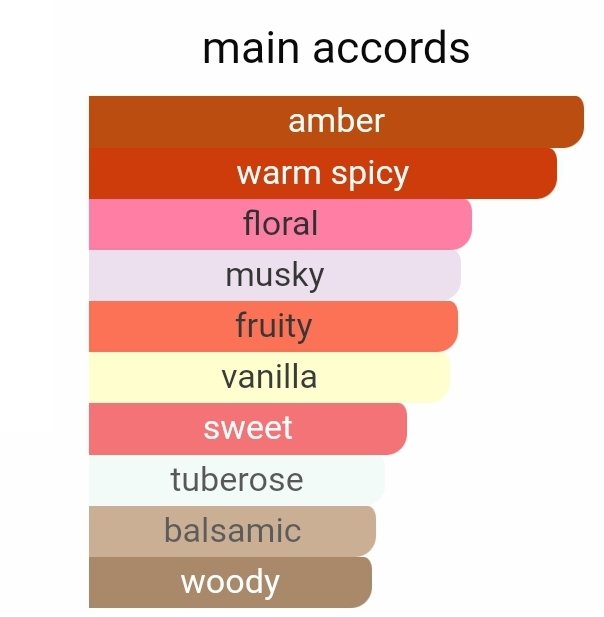 نتهای پایانی شامل وانیل، آمبرکسان، چوب سدر و مشک بوده که رایحهای گرم، شیرین و کمی تلخ ایجاد میکند و ماندگاری و پخش بالایی دارد.