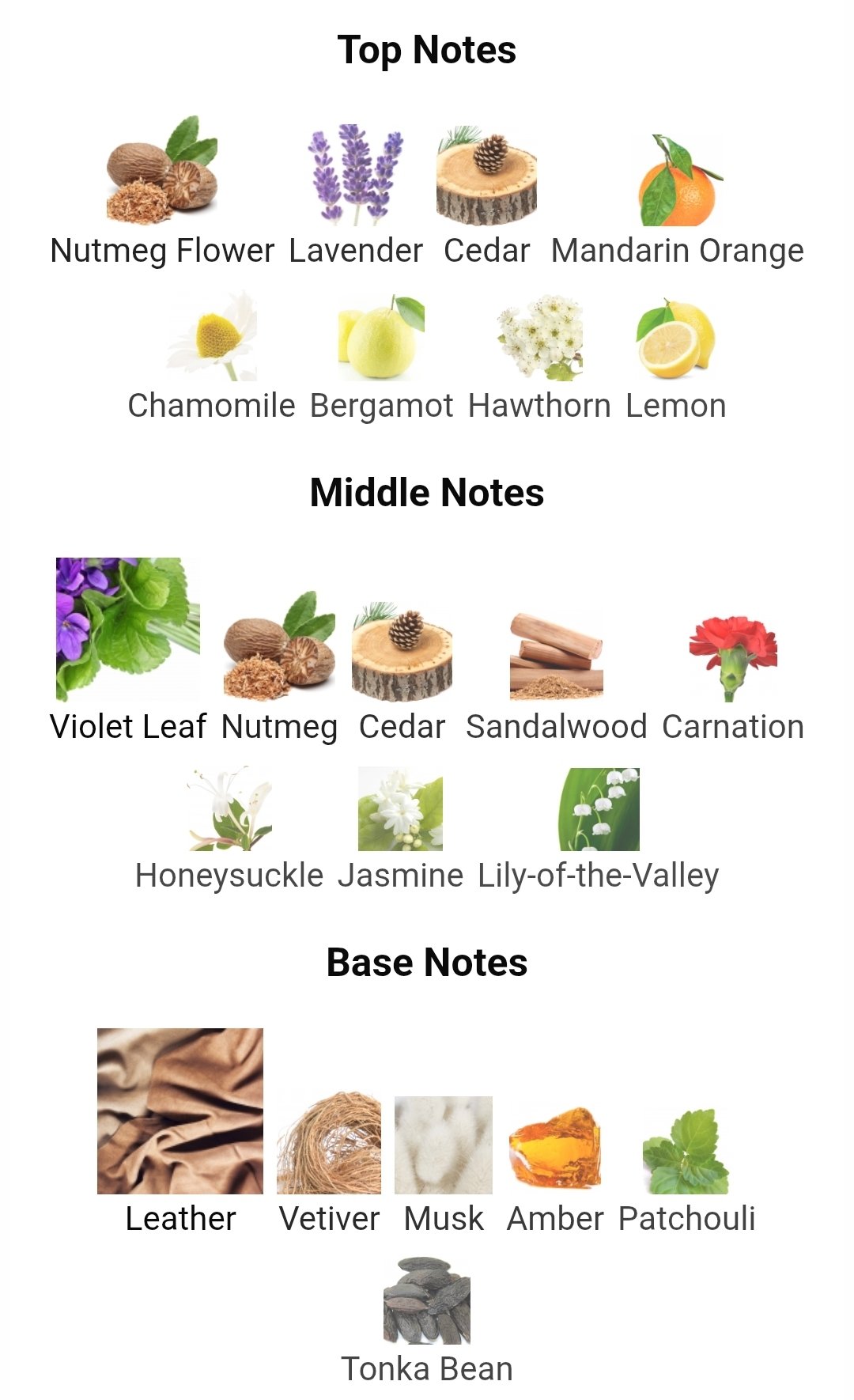 برگ بنفشه ,جوز ,چوب صندل ,سدر ,سوسن ,شهد عسل ,گل میخک ,گل یاس |
