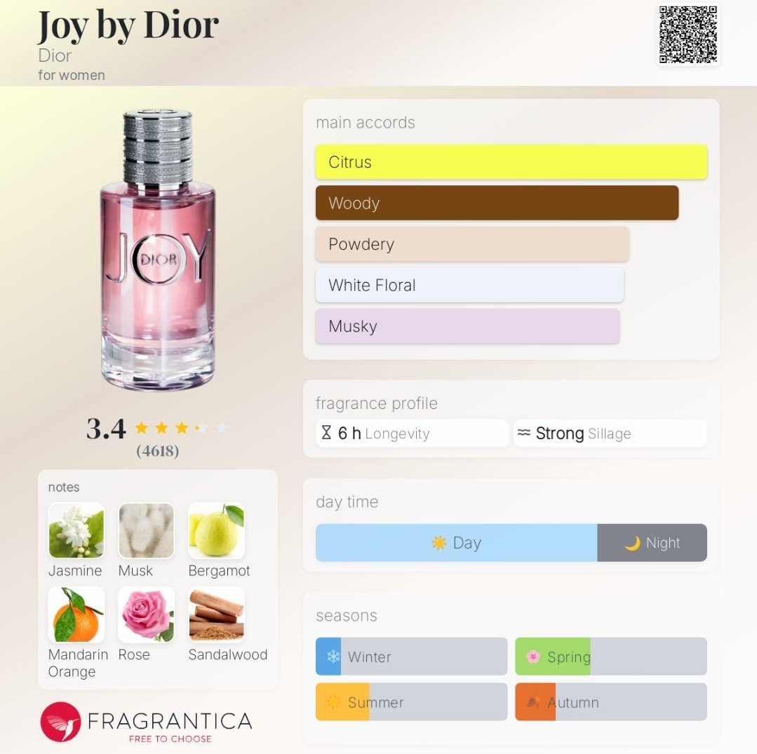 دیور جوی زنانه عطری ملایم و شیرین با فضایی شاداب و زنانه است که در گروه بویایی گلی چوبی مشکی قرار میگیرد و برای استفاده روزمره و موقعیتهای رسمی انتخابی متعادل و دلنشین محسوب میشود.