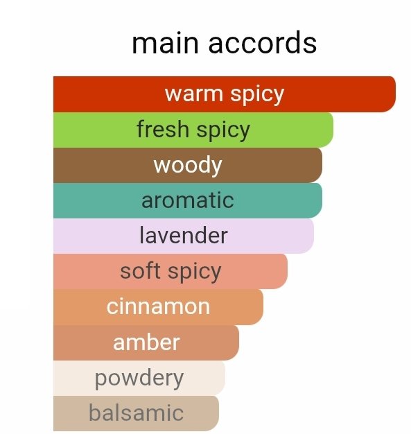 این عطر با نتهای ابتدایی دارچین، جوز هندی، هل و گریپ فروت آغاز میشود و در نت میانی با حضور اسطوخودوس، تعادل و تازگی ایجاد میکند.