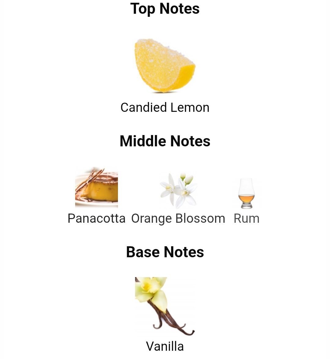 شروع رایحه با نت لیمو شکری حس تازگی و شیرینی ملایمی ایجاد میکند که به جذابیت عطر میافزاید. در قلب عطر، ترکیب شکوفه پرتقال، پاناکوتا و رام، فضایی گرم و نرم با شیرینی لطیف و کمی کرمی شکل میدهد که احساس آرامش و لوکس بودن را به همراه دارد.