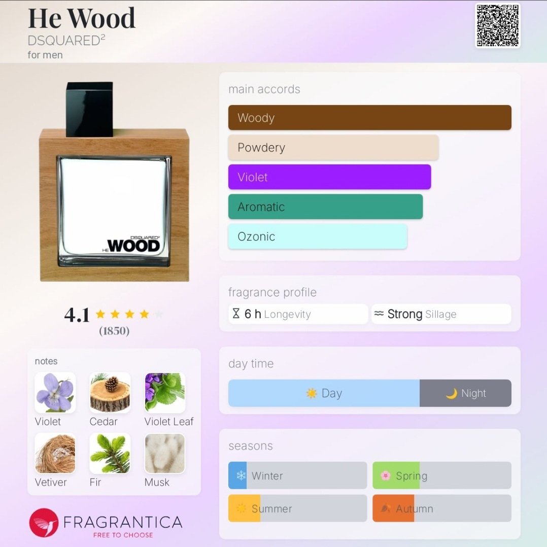 دسکوارد۲ هی وود مردانه عطری ملایم و تلخ در گروه بویایی چوبی معطر است که با الهام از طبیعت بکر و جنگلهای کانادا طراحی شده است. این ادوتویلت با نتهای پودری و سبز برگ بنفشه و گل بنفشه آغاز میشود که حسی از تازگی باران در جنگل را تداعی میکند.