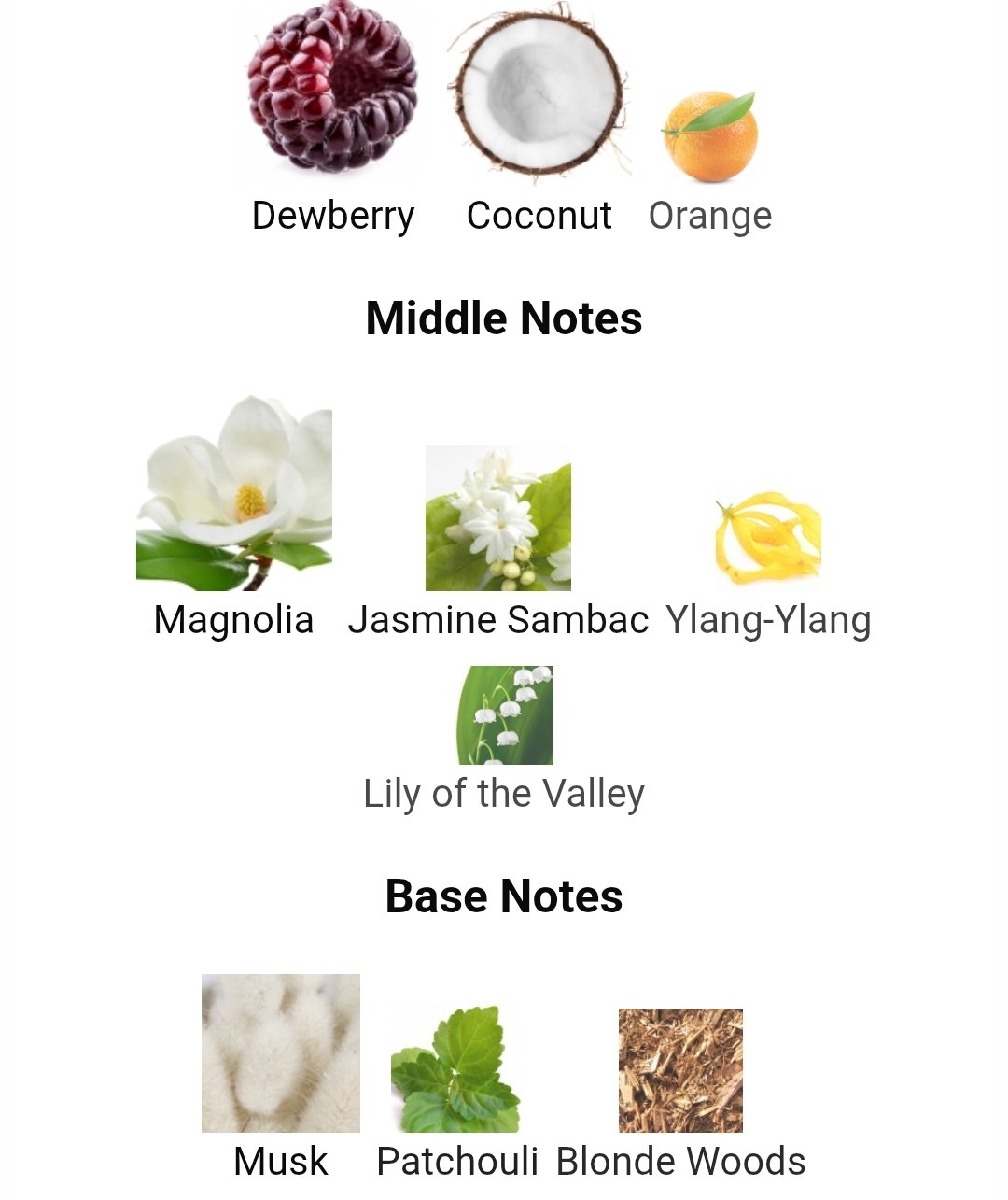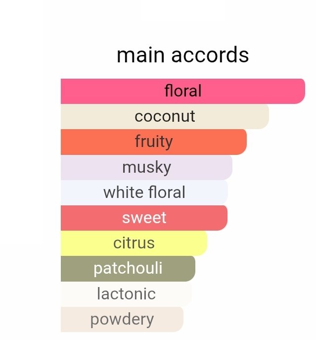 نت ابتدایی با ترکیب توت کوهی، پرتقال و نارگیل فضایی میوهای، تازه و کمی گرمسیری ایجاد میکند. در نت میانی، گل مگنولیا نقش اصلی را ایفا میکند و همراه با یاس سامباک و مریم گلی فضای گلی–معطر و زنانه را تکمیل میسازد. در نت پایانی نیز چوبهای روشن (Blonde Woods)، نعنا هندی و مشک عمق، گرما و لطافتی ماندگار ایجاد میکنند.