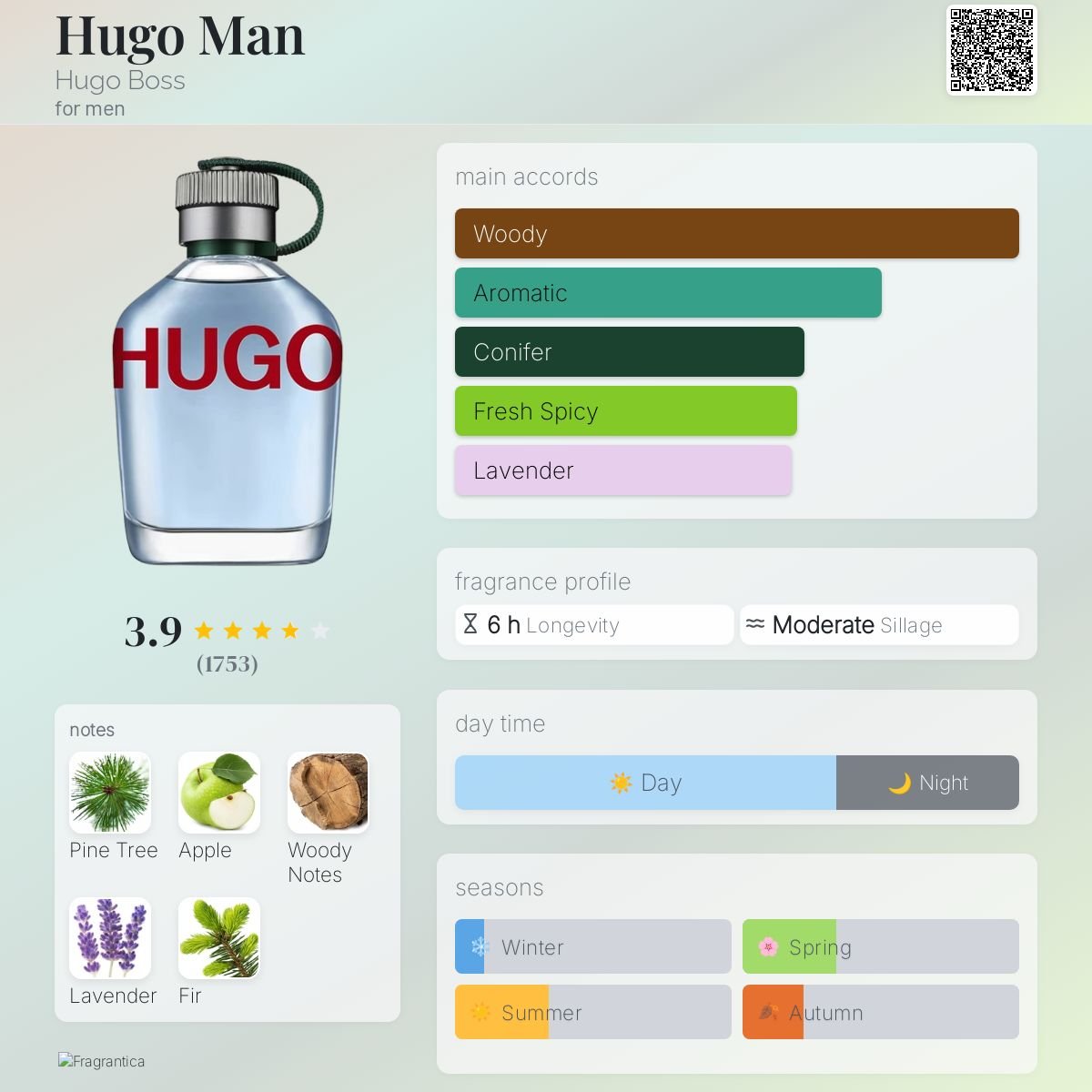 در لایه نهایی، حضور روایح چوبی و درخت کاج، پایانی ماندگار و حس طبیعت را رقم میزند. این شاهکار آلمانی با ماندگاری ۶ از ۱۰ و پخش بوی ۶ از ۱۰، تعادلی بینظیر میان تازگی مرکبات و خنکی گیاهان ایجاد کرده است. هوگو من به خوبی میتواند امضای شخصی شما در فصلهای بهار و تابستان باشد.