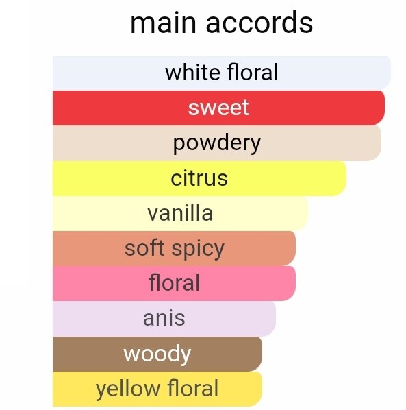 در آغاز، ترکیب شکوفه پرتقال، گل رز، ماندارین و آنیسون ستارهای فضایی شیرین، لطیف و کمی ادویهای ایجاد میکند که حس زنانگی و جذابیت را بهخوبی منتقل میسازد. این شروع دلنشین، رایحه را گرم و صمیمی نشان میدهد.