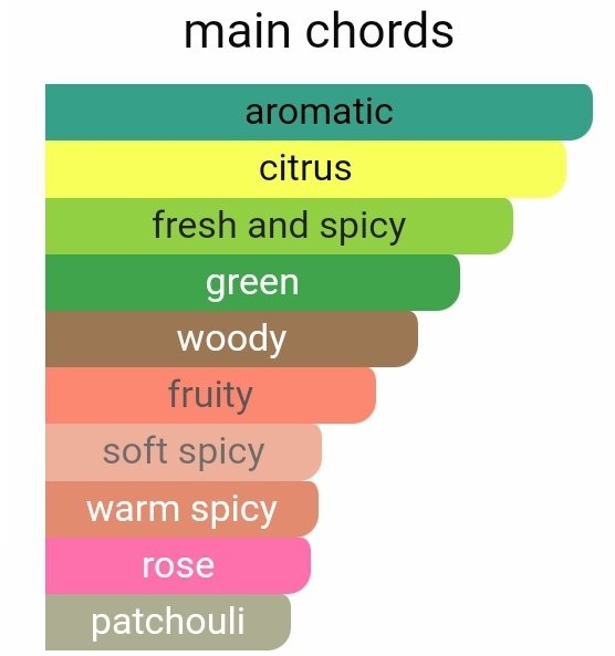 در نت ابتدایی، ترکیب نارنگی، برگ مو و ترنج حس طراوت و تازگی فوری ایجاد میکند و شروعی سبز و طبیعی به عطر میبخشد.