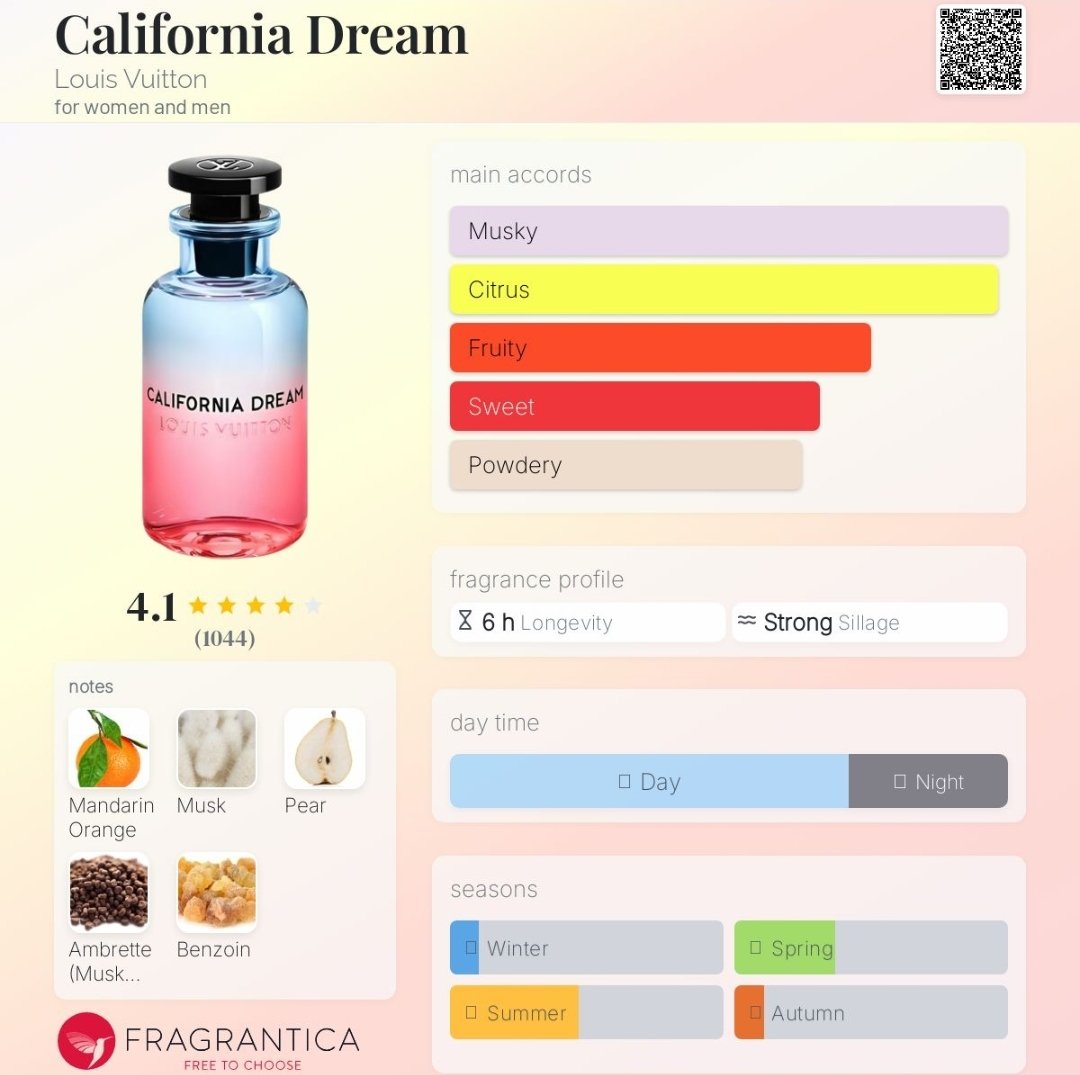 California Dream با ماندگاری بسیار بالا (9 از 10) و پخش بوی عالی (9 از 10)، گزینهای ایدهآل برای استفاده روزانه، قرارهای دوستانه و موقعیتهای خاص است. عطری یونیسکس از فرانسه که بهخاطر سبک میوهای–مرکباتیاش، محبوبیت زیادی بین علاقهمندان لویی ویتون پیدا کرده است.