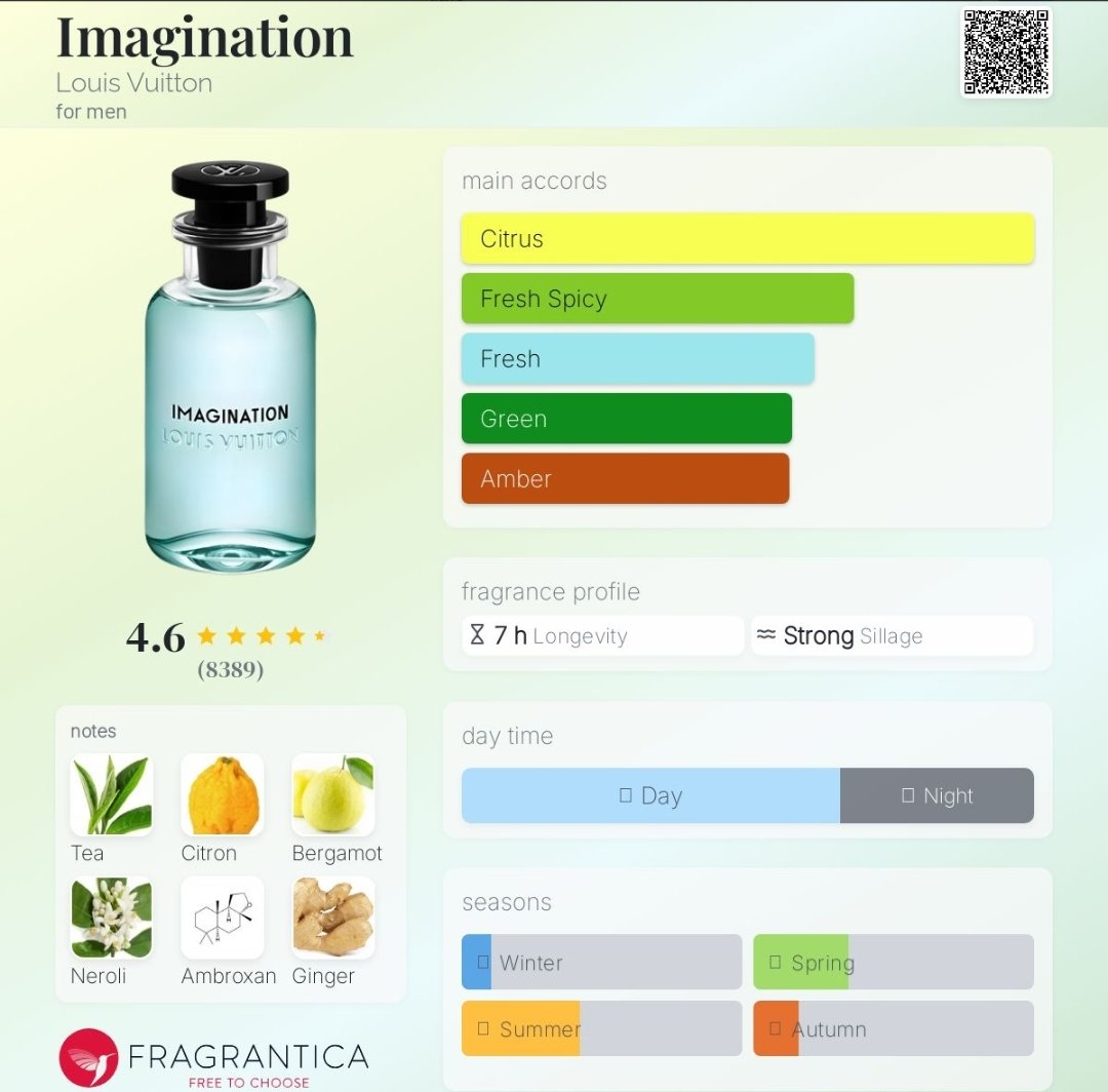 عطر Imagination از برند لوکس Louis Vuitton در سال 2021 معرفی شد؛ عطری خنک، تلخ و بسیار خاص که برای مردان خوشسلیقه و رویاپرداز طراحی شده است. نت ابتدایی این ادوپرفیوم با ترکیبی شاداب از بالنگ، ترنج و پرتقال آغاز میشود که انرژی و طراوت را منتقل میکند. سپس با نتهای زنجبیل، دارچین سیلان و بهار نارنج وارد قلبی پر از هیجان میشود و در نهایت با نتهای عمیق چای سیاه، چوب گایاک، صمغ کندر و آمبروکسان آرام میگیرد.