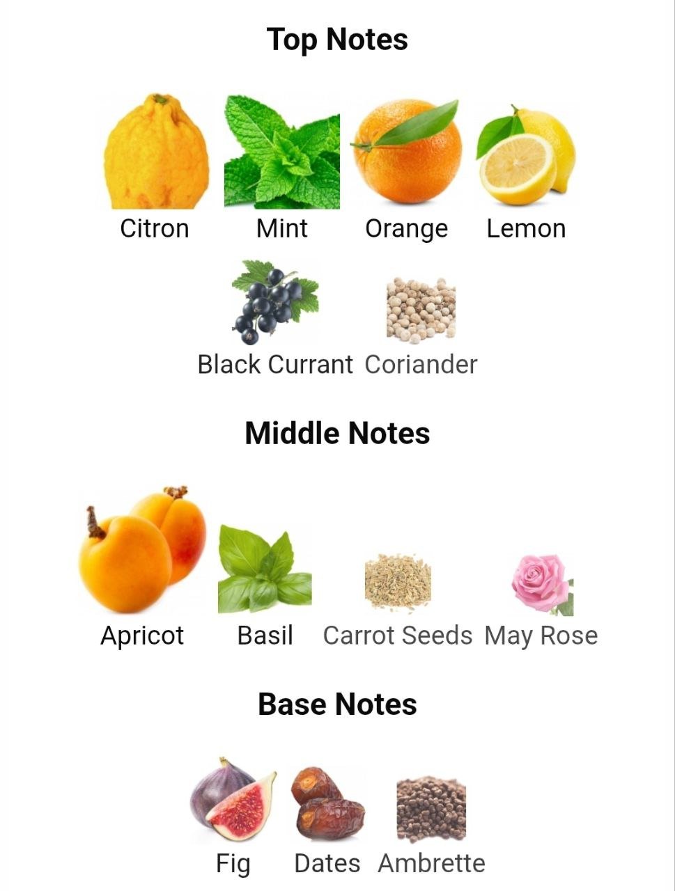 در ادامه، حضور زردآلو، دانه هویج، رز و ریحان در نت میانی، رایحهای میوهای، لطیف و کمی سبز به عطر میبخشد و آن را خاصتر میکند. سرانجام، ترکیب گرم و طبیعی انجیر، خرما و آمبرت رایحه را امضا میکند و هارمونی منحصربهفردی از تلخی ملایم و خنکای ماندگار را به وجود میآورد.