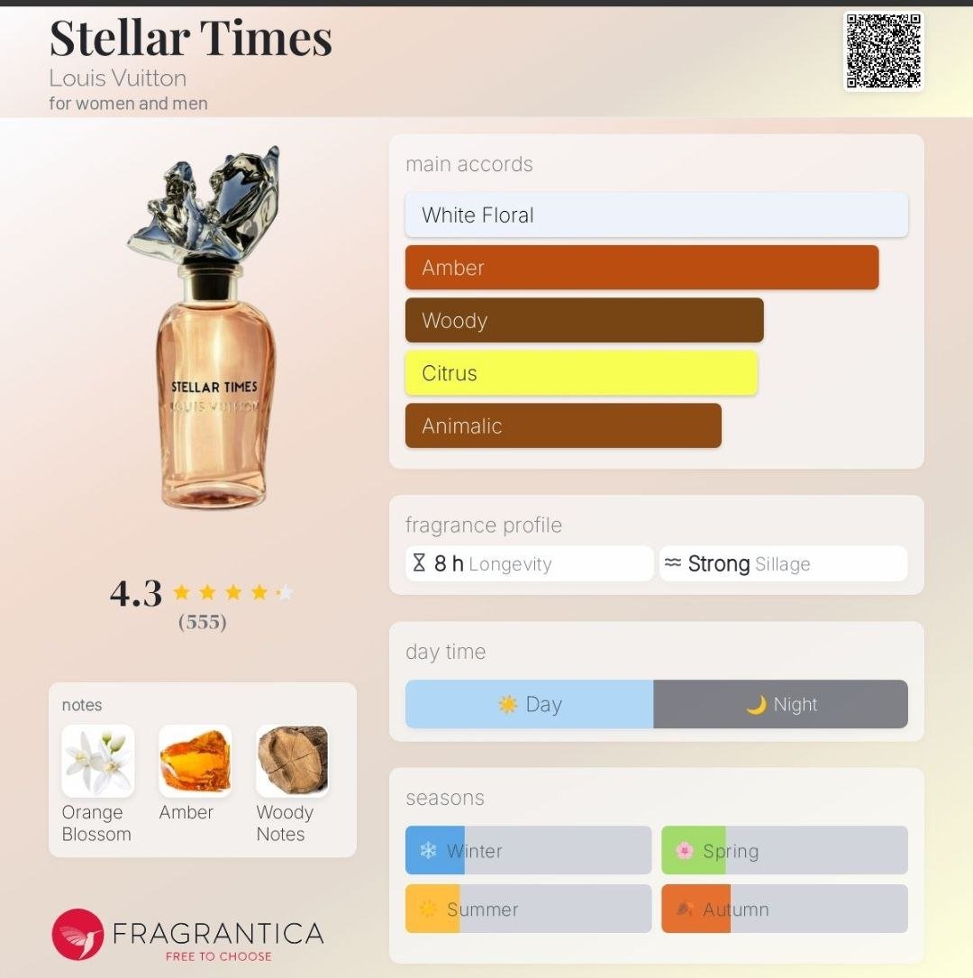 Stellar Times یکی از رایحههای هنری و منحصربهفرد لاین Les Extraits از Louis Vuitton است؛ عطری یونیسکس با رایحهای ملایم و شیرین که تجربهای آسمانی و باشکوه از ترکیب کهربا و شکوفههای درخشان پرتقال ارائه میدهد. این عطر لوکس، ساختهٔ عطرساز مشهور Jacques Cavallier Belletrud بوده و با امضای جذاب، گرم و عمیق خود توجه علاقهمندان به روایح شرقی–گلی را جلب میکند.