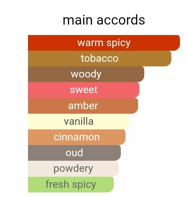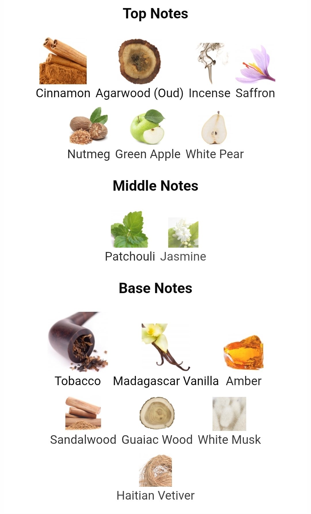 در پایان، وانیل، تنباکو، خسخس، صندل سفید و مشک رایحهای گرم، دودی و ماندگار بر جای میگذارند که امضای اصلی این عطر محسوب میشود.