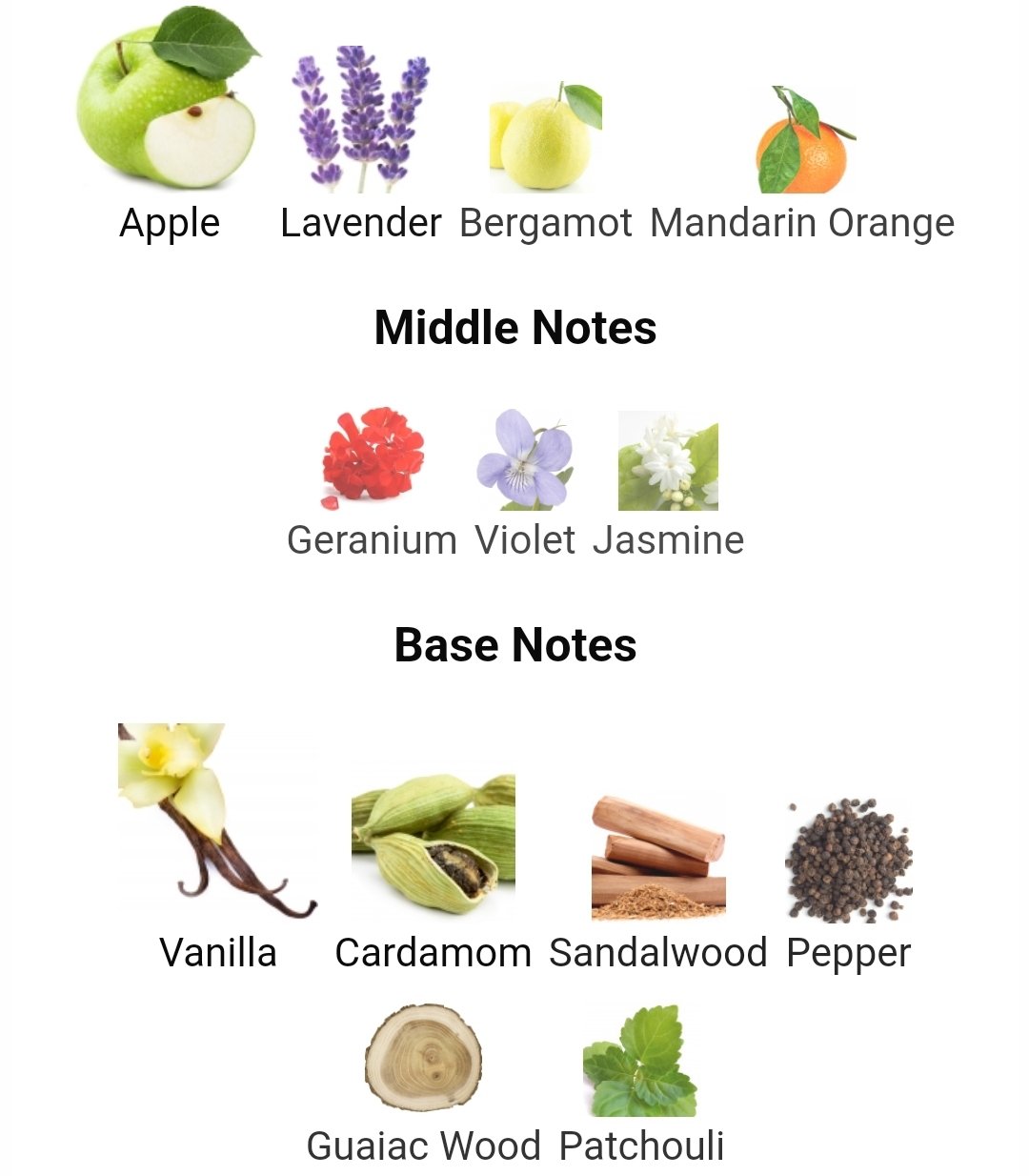 چوب صندل ,چوب گایاک ,فلفل ,نعنا هندی ,هل ,وانیل |