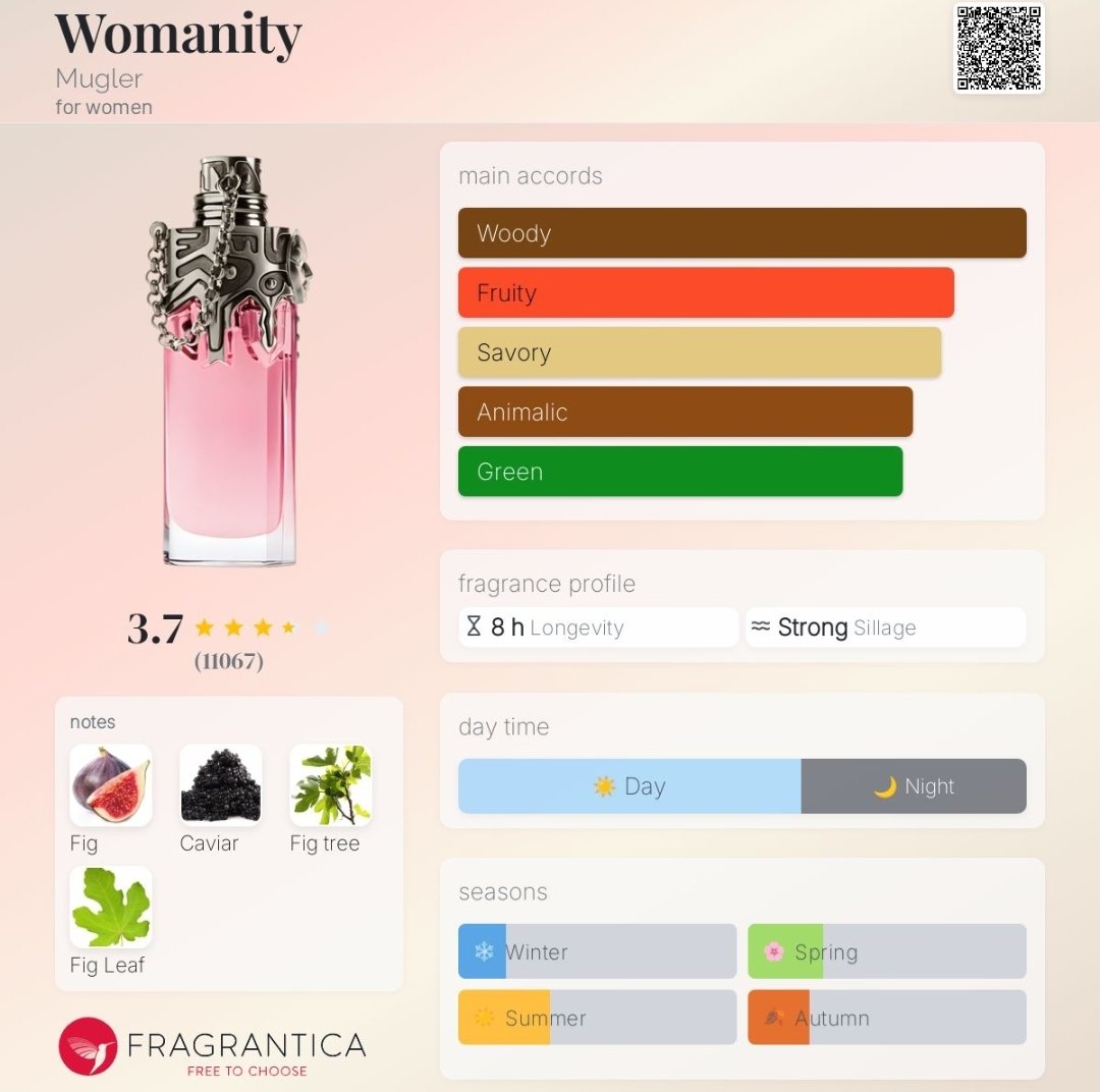 موگلر وومنیتی زنانه عطری ملایم و تلخ در گروه بویایی معطر میوهای است که با نگاهی آوانگارد به دنیای عطرها طراحی شده است. این ادوپرفیوم فرانسوی با تمرکز بر اجزای درخت انجیر (برگ و چوب) آغاز شده و در قلب خود رایحه گوشتی و شیرین میوه انجیر را به نمایش میگذارد.