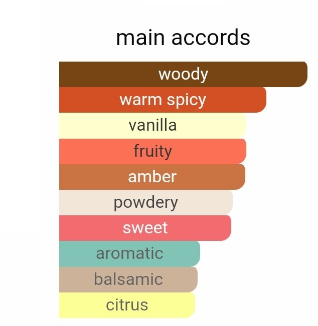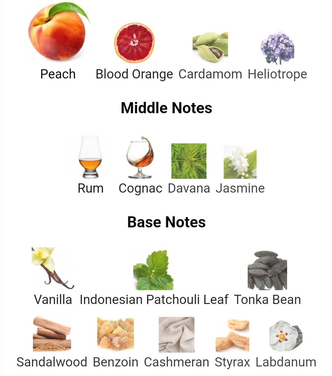 در قلب رایحه، یاس در کنار کنیاک و رام حالتی گرم، اغواگر و لوکس به عطر میبخشد و شخصیت خاص آن را برجسته میکند.