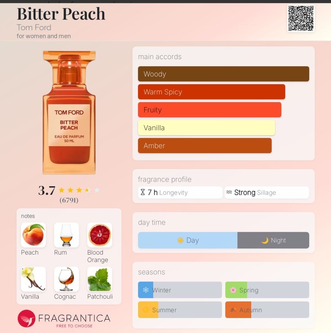 تام فورد بیتر پیچ زنانه عطری گرم و شیرین در گروه بویایی گلی میوهای است که با رایحهای جسور، اغواگر و مدرن، حس لوکس و متفاوتی را منتقل میکند. این عطر انتخابی خاص برای خانمهایی است که به رایحههای عمیق و جذاب علاقه دارند.