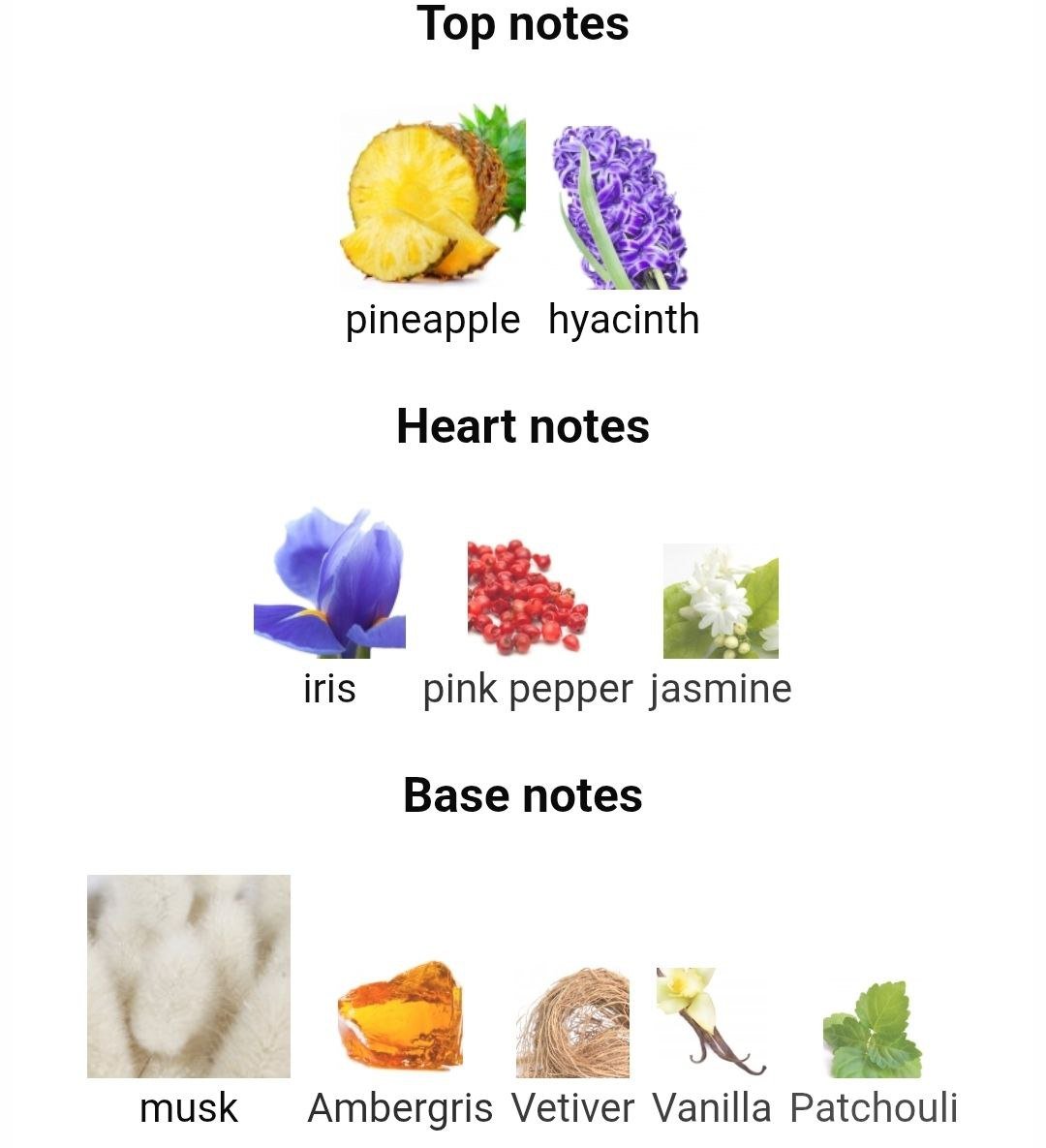 این عطر با نتهای آغازین آناناس و سنبل شروع میشود؛ شروعی تازه، میوهای و کمی تیز که انرژی زیادی به مصرفکننده میدهد. در میانه راه، رایحههای یاس، زنبق و فلفل صورتی به عطر عمق و لطافت میبخشند و حسی اشرافی و مجلل ایجاد میکنند. پایه عطر، ترکیبی گرم و جذاب از وانیل، کهربا، نعنا هندی، مشک و خسخس است که ماندگاری بسیار بالای اکسنتو را شکل میدهد.
