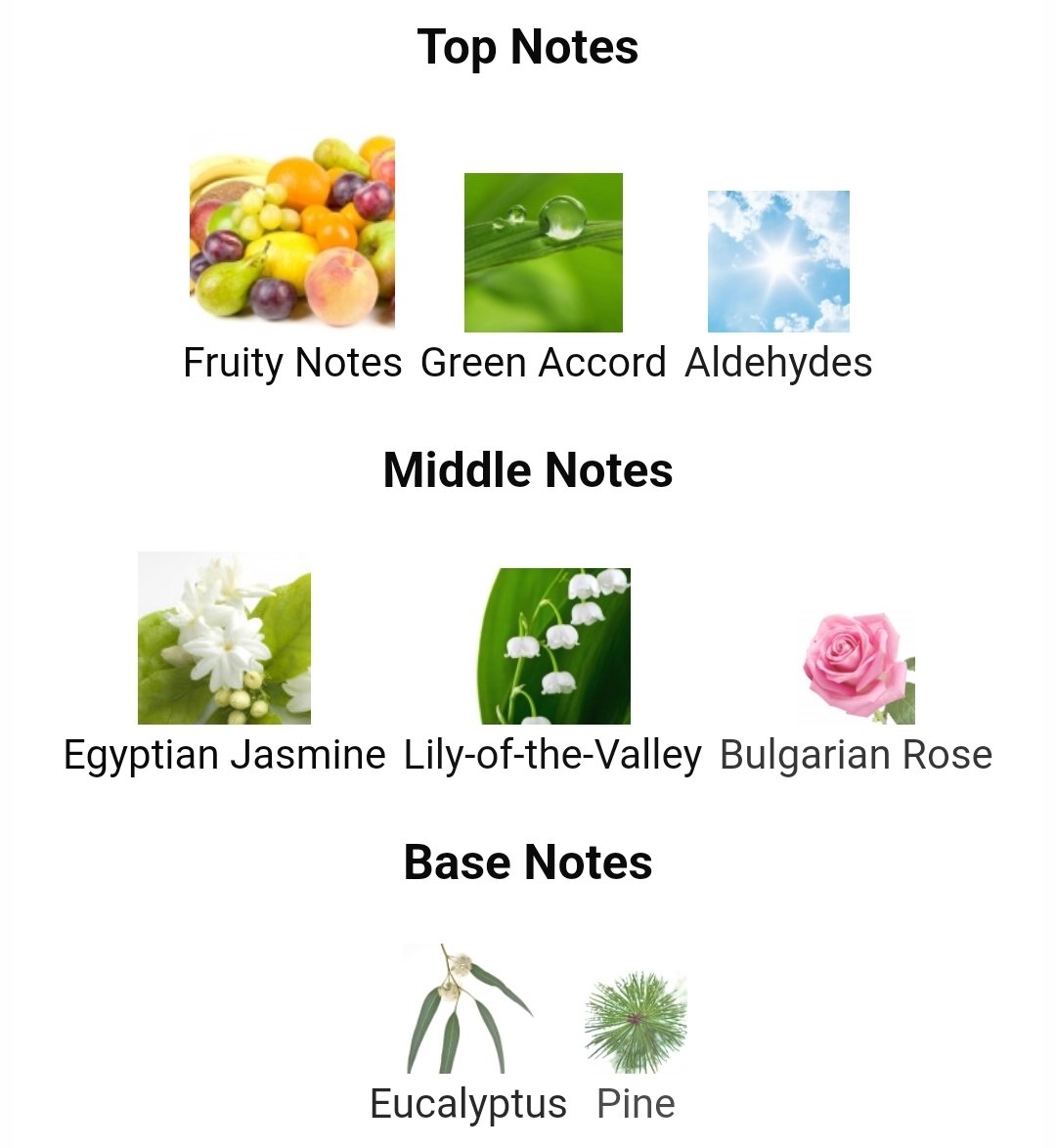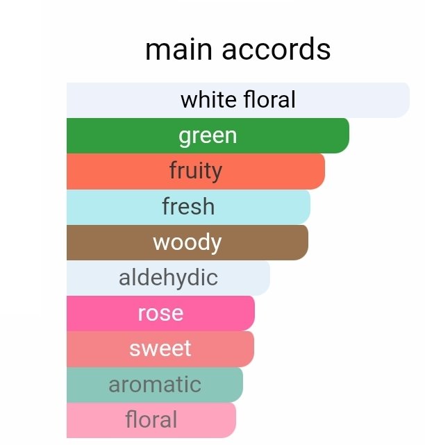 نت ابتدایی با حضور آلدهید، آکورد سبز و نتهای میوهای فضایی تازه و زنده ایجاد میکند که حس نشاط و شادابی را به همراه دارد. در نت میانی، رایحههای گل رز، یاس مصری و گل برف فضای گلی و لطیفی را به عطر میبخشند که حس زنانگی و ظرافت را تقویت میکند.
