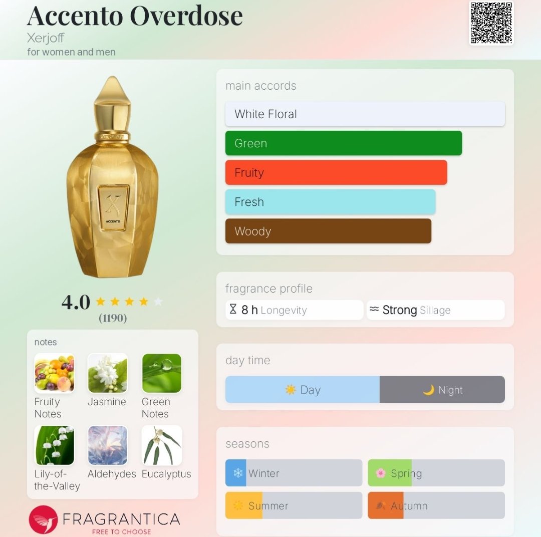 عطر زرجف اکسنتو اوردوز با رایحهای ملایم و شیرین در گروه بویایی گلی آلدهیدی قرار دارد. این عطر برای خانمها و آقایانی که به دنبال رایحهای تازه، شفاف و با ظرافت هستند، انتخابی ایدهآل است.