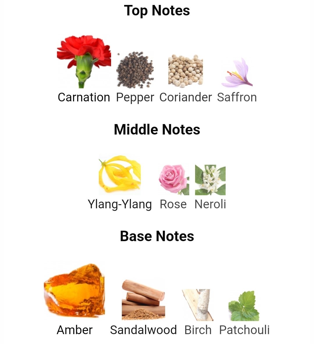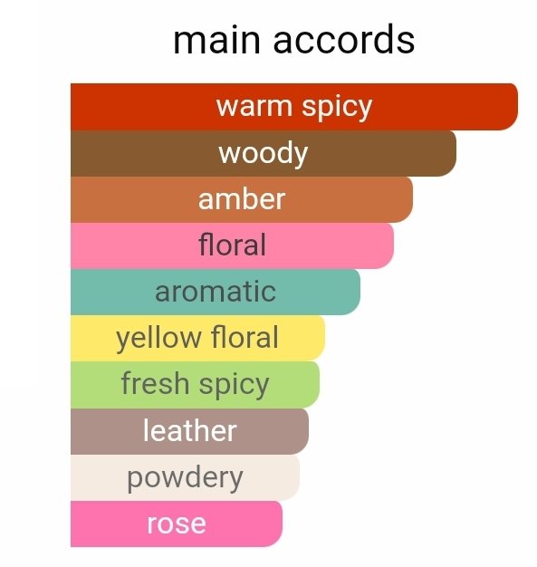 در نتهای میانی، بهار نارنج، رز و یلانگ ترکیبی گلی و لطیف میسازند که تعادل زیبایی میان گرمای ادویهها و لطافت گلها ایجاد میکند و رایحه را عمیقتر و دلنشینتر میسازد.