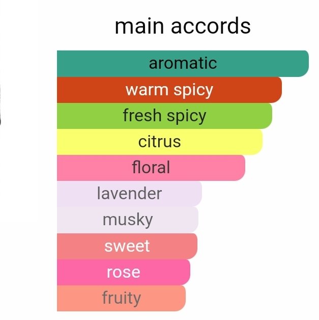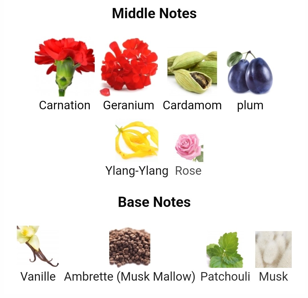 در آغاز، ترکیب لیمو ترش، ترنج، اسطوخودوس و شکوفه لیمو حس تازگی و طراوتی تمیز و شفاف ایجاد میکند. در ادامه، نتهای ادویهای و گلی مانند میخک، شمعدانی، هل، یلانگ یلانگ و رز به عطر عمق و پیچیدگی میبخشند. در نت پایانی، وانیل، نعنا هندی، مشک و گل ختمی رایحهای نرم، گرم و ماندگار بر جای میگذارند.