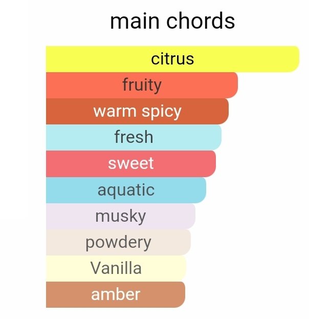 نت ابتدایی شامل ترنج، نارنگی و لیمو ترش است که طراوت و تازگی را به رایحه میبخشد.