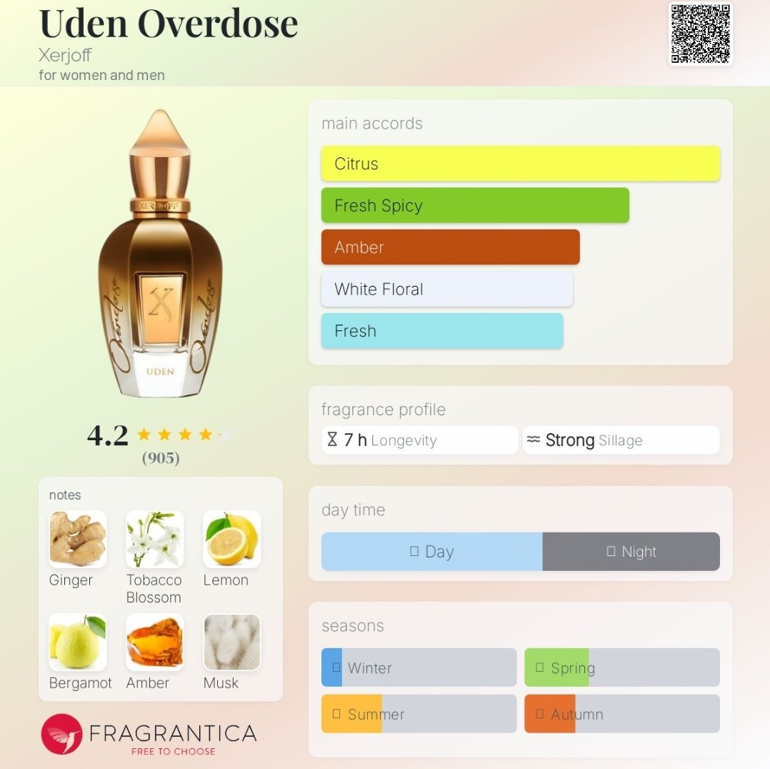 عطر Xerjoff Uden Overdose یکی از محبوبترین شاهکارهای برند ایتالیایی زرجف است که در سال ۲۰۱۸ معرفی شد. رایحهای ملایم، تلخ و کاملاً مدرن دارد که با تازگی لیمو و ترنج آغاز میشود. در نت میانی، زنجبیل و شکوفه تنباکو عمق و گرمایی جذاب به عطر میبخشند و در پایان، ترکیب مشک و کهربا امضایی ماندگار و اغواکننده ایجاد میکند.