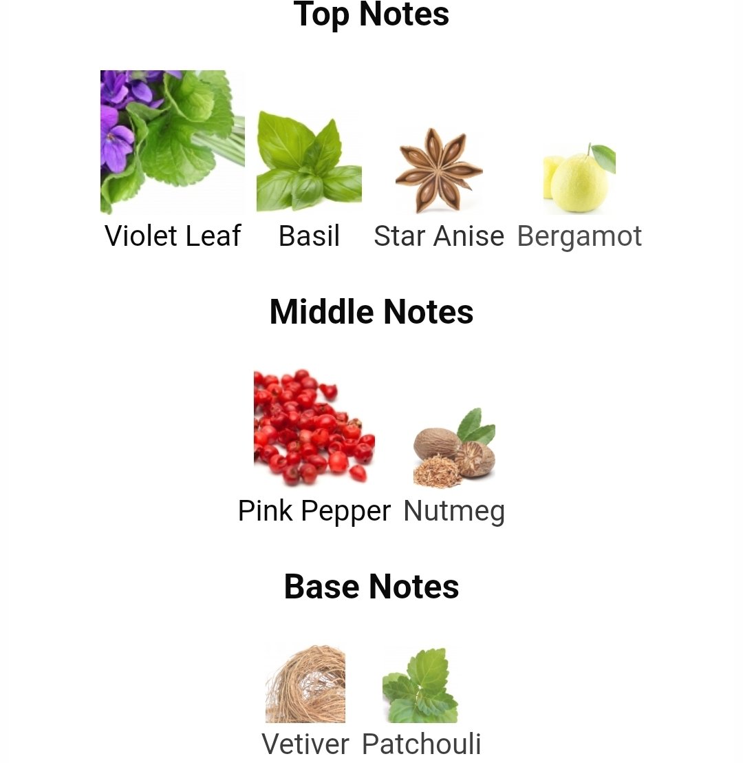 نت ابتدایی این عطر با رایحه آنیسون ستارهای، بنفشه، ریحان و ترنج آغاز شده که حس سبز و مرکباتی ملایمی ایجاد میکند.