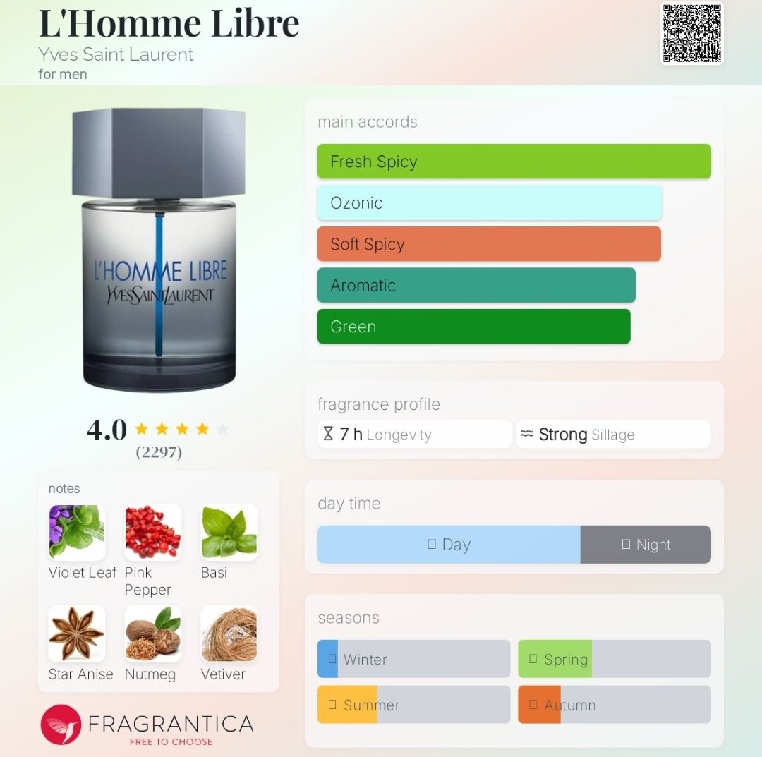 ایو سن لورن لهوم لیبر مردانه عطری ملایم و تلخ چوبی ادویهای با نتهای آنیسون، فلفل صورتی و نعنا هندی، مناسب استفاده روزمره با ماندگاری متوسط.